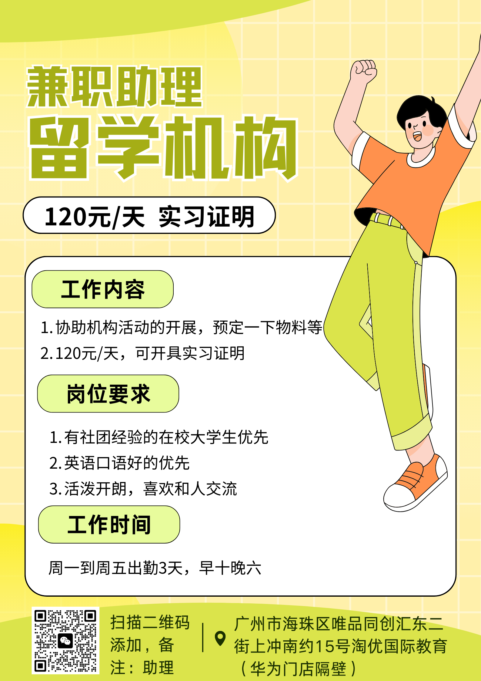 | 留学机构招小助理啦,协助活动开展,预定物料即可,一周兼职3天即可,还能开实习证明! |