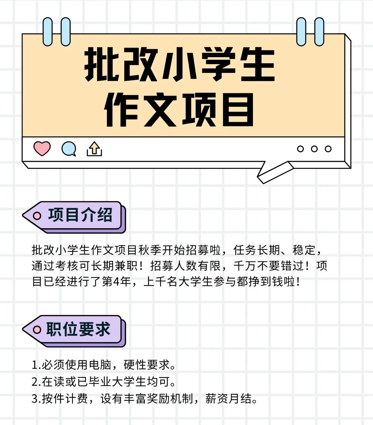 | 批改小学生作文,长期有任务,做的多费用越高! |